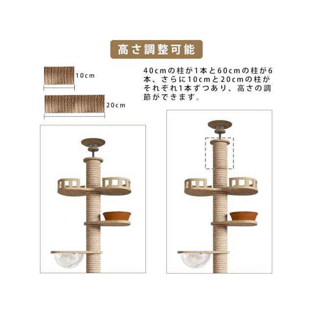 【頑丈で安定している】このキャットタワーは大型猫用に設計されており、頑丈な木製の構造を採用しています。直径12cmのサイザル麻ポールは、猫の爪とぎに最適で、家具や壁を傷つけることなく、猫が自由に爪を研ぐことができます。高さ258~290cmの調節可能な設計により、天井にしっかりと固定でき、安定性も抜群です。多頭飼いにも対応でき、複数の猫が同時に使用しても問題ありません。キャットツリーとして、猫の遊びと休憩場所を一つで提供します。