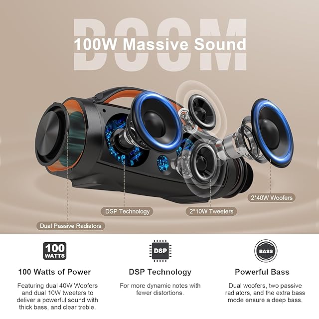 ♪【100W迫力たっぷりのサウンド】2つの40Wドライバーと2つの10W高音スピーカーにより、合計100wのドライバーを備えて、ブルートゥーススピーカーからパワフルな低域と解像感の高いきらびやかな高域を強調したドンシャリな音をお届けします。業界最先端のDSP技術を採用し、音の歪みを最小限に抑えて高音でも澄んだサウンドを実現し、リッチな音色を持つ大音量を奏でます。