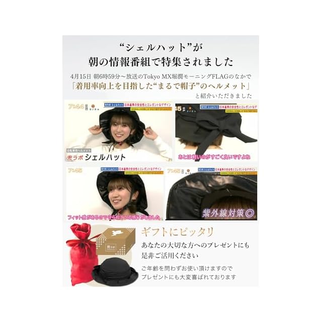 【帽子部分は、広めのつばでエレガントなシルエット&バックリボンで可愛く上品に!】 帽子部分は広めのツバでエレガントなシルエットとなっており大人の女性のファッションに溶け込みます。帽子の後ろ側にはバックリボンがついており可愛いデザインとなってます。帽子のツバにはソフトワイヤーが入っており、走行中はツバを上にあげることで視野を広く保つことが可能です。