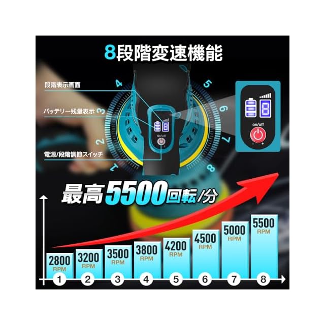 YUUYOU電動ポリッシャーには和式研磨バフが装備されており、日本車により適しています。 PL保険加入済みの製品ですので、安心してご使用ください。2024年7月には、浴室タイルの掃除や金属サビの除去がより便利になるよう、ナイロンたわしパッドを2枚追加しました。▲【8段階変速可能★偏心構造】電動ポリッシャーは従来の2段階変速製品に比べる8段階の変速にアップグレードされ、研磨シーンに応じて細かく変速できます。ポリッシャーの操作も簡単でスイッチを長押しすれば起動し、一回押すごとに速度が1段階上がります。作業内容に合わせて回転数は2800rpmから5500rpmの範囲で調整可能です。ポリッシャーは新しい偏心構造の回転方式を採用し、9mmの不規則な偏心軌道を使用することでより省力化、より広いポリッシング面積と強力なポリッシング力を提供します。傷のあるペイント面をカバーし、作業効率を大幅に向上させ、作業時間を短縮します。また、過熱の心配がないように、複数の放熱口も設計されています。(1-3段階はワックスを軽く塗る。4-6段階は均一にワックスを塗る。7-8段階はワックスをしっかりと磨き込む)