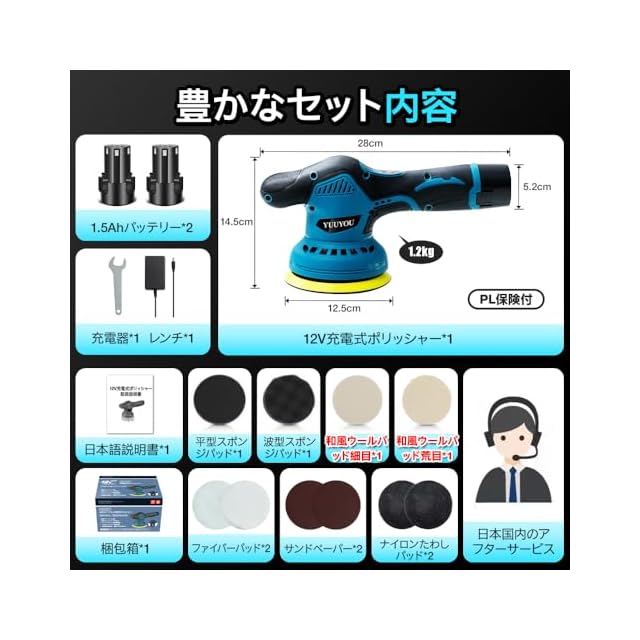 ▲【パッケージ内容★12ヶ月品質保証】セット内容:12V充電式ポリッシャー*1、1.5Ahバッテリー*2、和風ウールパッド細目*1、和風ウールパッド荒目*1、波型スボンジパッド*1、平型スポンジパッド*1、ナイロンたわしパッド*2、ファイバーパッド*2、サンドペーパー*2、日本語説明書*1。本体重量:1.2kg、サイズ:28*14.5*12.5cm。YUUYOUブランドを提供する有容合同会社は信用とサービスを重視する日本の会社です。弊社のポリッシャーにはPL保険に加入し、PSE認証も取得しておりますので、ご安心してご利用ください。また、YUUYOUポリッシャーは12ヶ月品質保証とアフターサービスを提供しております。ご質問があった場合、又は万が一商品に不具合が生じた場合があるなら、いつでもお気軽にお問い合わせください。必ず最善を尽くし、保証サービスを対応致します。