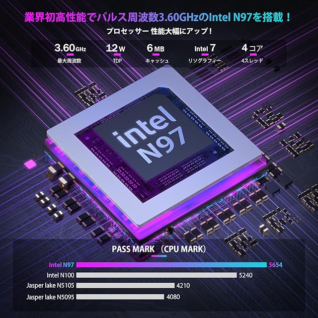 1.【2023業界初登場n97 ミニpc+ミニpc windows11搭載】高性能で低消費電力のパルス周波数最大3.60GHzのAlder Lake-N97(6Mキャッシュ、4コア4スレッド)を搭載。n97 ミニpcは、他のn100 ミニpcやn95 ミニpcに比べて全体で48%も性能が向上しています。非常にパワフルなmini pcは、ホーム サーバー、学校教育、Web ブラウジング、ビジネス オフィス、ビルボードなど、より要求の厳しいニーズを満たすのに十分です。従来のmini pcの不安定な動作、ブルー スクリーン、カクカク感フリーズする現象おに別れを告げましょう。より高速的な応答性とスムーズな快適性が得られます。●本ミニパソコンは最新版のオペレーティングシステム「Windows11」をインストールされております。わざわざ更新する手間が必要なし、製品到着後、すぐに使用できております。