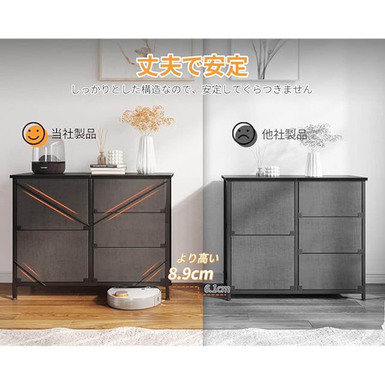【転倒防止&安全なデザイン】全シリーズは壁固定の部品が付いて、壁に固定すれば地震にあっても倒れないから安全です。チェストのフレームは上質で頑丈なスチール素材を採用されるため、長持ちのうえ、安定性・耐摩耗性に優れています。しっかりとした構造なので、安定してぐらつきません。