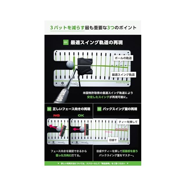 ✅【 1日たった5分でも入るパターが身に付く 】ご自宅のパターマットの上に置いて、パターグリーンで、ラウンド前のアドレス確認に。重要ポイントが全て入っているからいつでもどこでも効率的なパター練習が可能。✅【 レ ベ ル を 問 わ ず 】 パターを上達させたい初級者やジュニアから、一打で人生が変わる世界のトッププレーヤーまで、世界中のスコアアップを目指したいゴルファーに選ばれています。