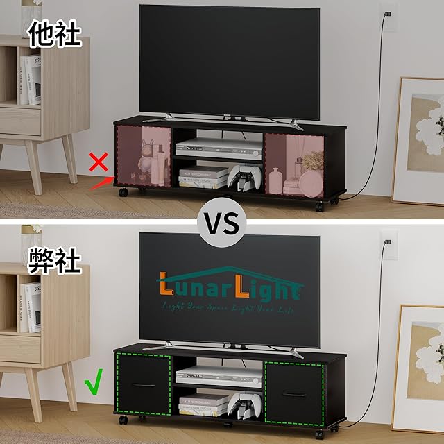 LunarLight テレビ台 本製品はテレビ台としてもローボードとしても活躍する多機能収納家具です。高さを抑えたデザインで圧迫感がなく、お部屋を広く見せる効果があります。左右両側にはたっぷり収納できる引き出しを備え、中央の棚板は3cm間隔で上下3段階に調整可能。収納する物の高さに合わせて自由にレイアウトできます。 天板には便利な2口コンセント付きで、テレビや周辺機器の電源確保もスムーズ。下部にはストッパー付きキャスターを搭載しており、移動やお掃除も簡単です。さらに、組み立てもシンプルで、女性一人でも安心して作業可能。 耐荷重は100kgと頑丈な構造で、安心してテレビやオーディオ機器を設置できます。シンプルでスタイリッシュなデザインは、和風・洋風を問わずあらゆるインテリアにマッチ。玄関や寝室、リビングなど、様々な空間で使いやすい万能テレビ台です。