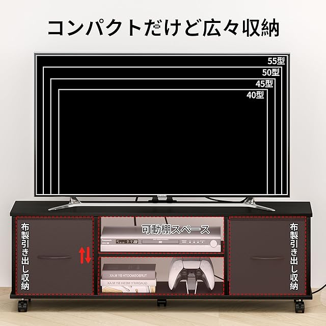LunarLight テレビ台 幅109.5奥行28.6高さ36.8cm テレビボード ローボード コンセント付き 布製引き出し付き 多機能収納ボックス 収納棚板調整可能 32型 42型 55型テレビ適合 収納 組立簡単 工具不要 耐震転倒防止 耐荷重100kg (ブラック) | primer