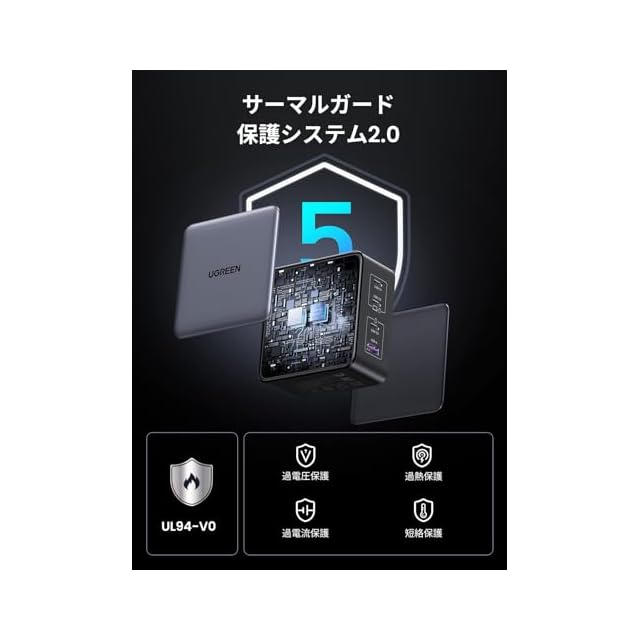 【独自の温度検知/制御技術 Thermal Guard】UGREENの独自の温度検知/制御技術・Thermal Guardは、ミリ秒単位の温度検出により過熱、過充電、過電流を制御します。温度変化をリアルタイムで検知し、適切な電流をデバイスにスマートに分配することで、バッテリーの劣化を防ぎつつ安心の高速充電を実現します。シェルは耐火性および難燃性に優れた高級PVC素材を採用、落下による衝撃から保護します。 .