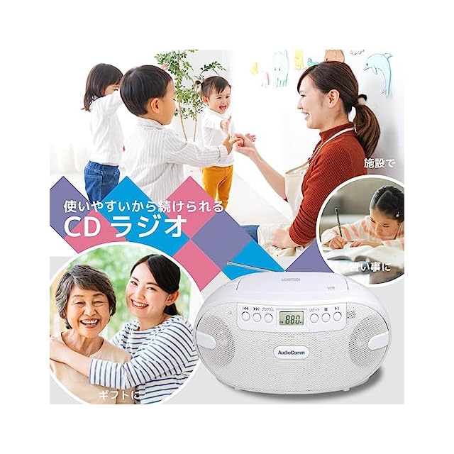 ◆ワイドFM(FM補完放送)対応 ◆CDプログラム(最大20曲まで)・リピート・ランダム再生機能付き ◆CD/選局液晶表示 ◆ヘッドホン出力端子、外部音声入力端子付き ◆キャリーハンドル付き ◆FMロッドアンテナ付き ◆本体カラーはホワイト