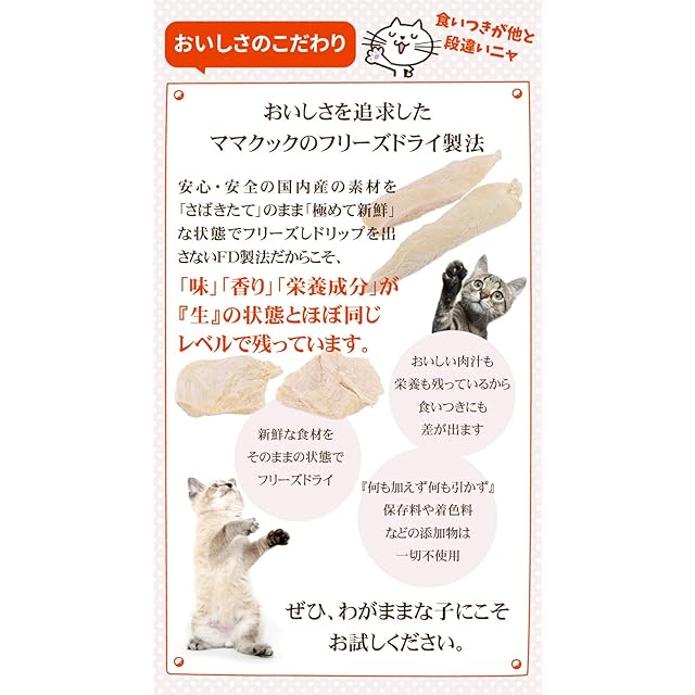 【商品概要】 【商品説明】 ママクックのフリーズドライのムネ肉猫用は低カロリーで脂質のおいしさ!ササミと交互に 【商品詳細】