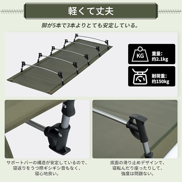 軽くて丈夫なコット:ベッド脚が5本で3本よりとても安定している。重量を均等に分散させ、耐久性にも優れています。 寝転しても座っても強度に問題はありません。ベッドはとても快適で、一晩中よく眠れましたし、寝返り時にギシギシ音もありません。