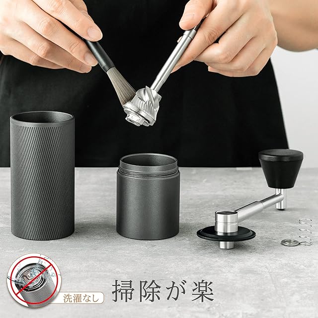 【手動コーヒーミルの素材と仕様】ホッパに入るコーヒー豆容量:約20g。サイズ:ボディー(ハンドルを含む):160*53*147mm 重量:約500g。セット内容:手動式ミル本体、ブラシ付き、専用収納袋付き。*水で洗わないで、付属のブラシを使ってお手入れお願いします。