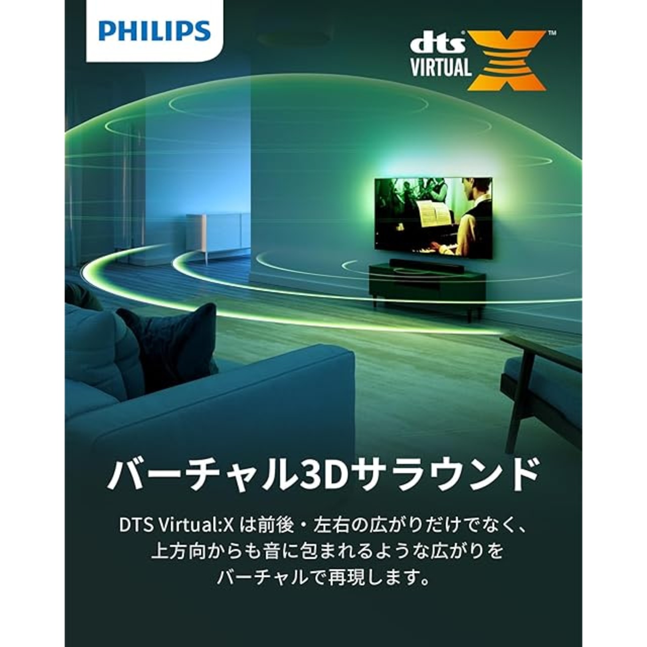 【映画館のような没入型サウンド】:PHILIPS サウンドバーは2つのユニットを内蔵で、バイネルスピーカーはステレオ効果を生み出し、空間に音楽のサラウンド分布を感じることができます。音楽をよりダイナミックに、思いのままに楽しむことができます。DTS Virtual:Xは広い3Dサラウンドサウンドを創造し、前面、左側、右側とサラウンドサウンドに高さを加え、より広く、より高く、より没入的なサウンド体験をお楽しみいただけます。雨や落雷、空中を旋回するヘリコプターなど頭上からのサウンドも的確に再現することで、アクション映画の視聴やテレビゲームのプレイに圧倒的な臨場感を与えます。