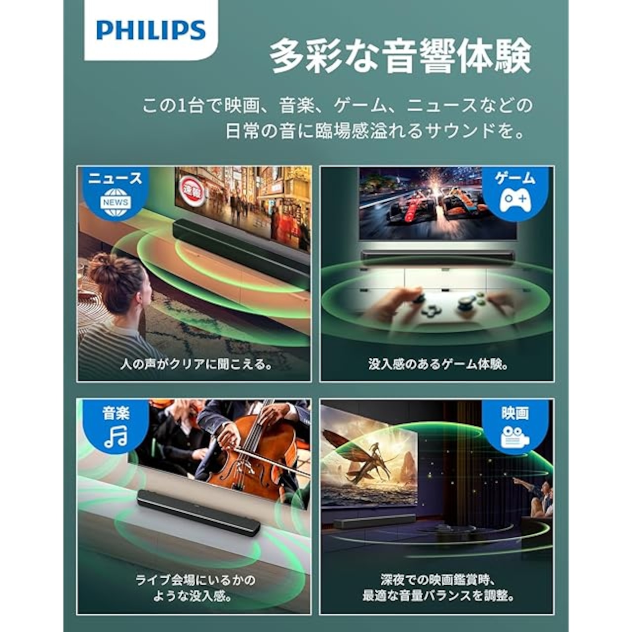 【シーン別のサウンドモード】:PHILIPS テレビスピーカーはDSP(デジタル・シグナル・プロセッサー)搭載して、ムービーモード、音楽モード、スタジアムモード、音声モードの4種類のサウンドモードから選択できます。ムービーモードでは力強い低音とバーチャルサラウンドサウンドにより、映画館にいるような臨場感を提供します。音楽モードではクリアでバランスの取れた高音、中音と深い低音を実現します。ニュースモードでは、会話を聞きやすくするために中音域が強化され、その他の音によって会話がかき消されません。