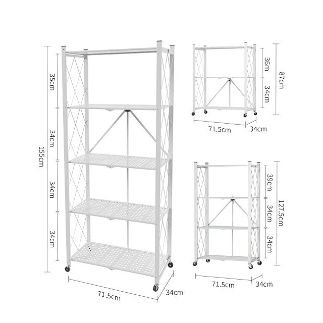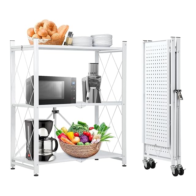 3段 折りたたみ棚 幅71×奥行34×高さ87cm 収納ラック スチールラック 折り畳みラック オープンラック 可動棚 メタルラック オープンシェルフ キャスター付き レンジラック 頑丈なキッチン金属 組み立て不要 Folding Shelf (White, 幅71×奥行34×高さ87cm) | primer
