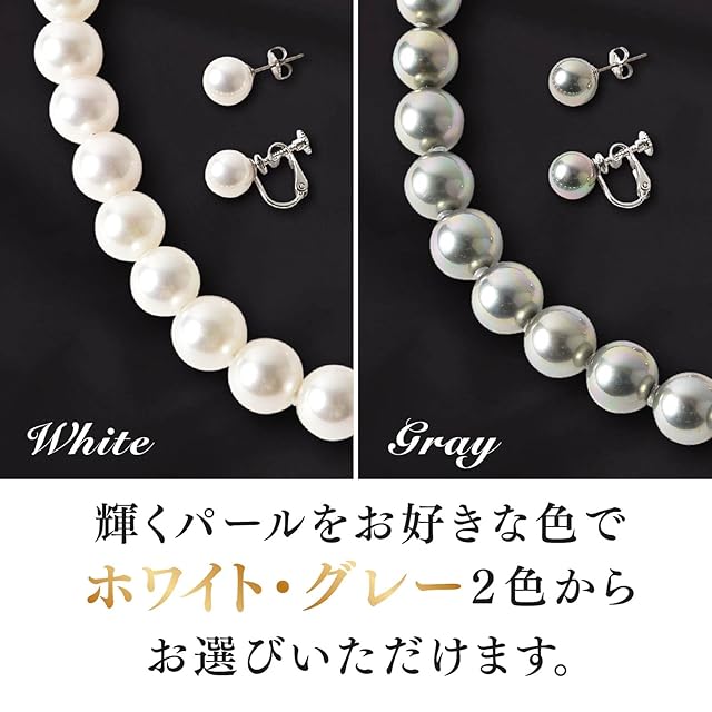 ✅【お好きな色、お好きな長さで】まつよの花珠貝パールはホワイトとグレーの2色をご用意しています。ホワイトパールをすでにお持ちの方におすすめのグレーパールは上品なツヤが特徴で控えめながらも一味違うパールアクセサリーとして1つはもっておきたい優れものです。ネックレスの長さは38cm、42cm、45cmの3種類をご用意。普段のファッションやお使いの場面に合わせてお好きな長さをお選びください。さらにセットでピアスかイヤリングかをお選びいただけます。ピアス穴が開いていなくても美しいパールのネックレスとイヤリングのセットで花珠貝パールの輝きを存分に楽しめます!