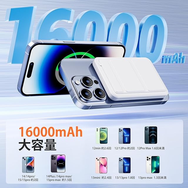 ⚡【超薄型で16000mAh大容量&3台同時充電】グネット式ワイヤレスモバイルバッテリーは16000mAh大容量を備え、iPhone16/15/14/13/12シリーズへ複数回充電が可能です。ワイヤレス急速充電だけでなく、USB-CケーブルとUSB-Aを使って充電も可能です。iPhone/iPad/Android 各種対応、3つのモバイルデバイスを同時に充電できるのはとても便利です。