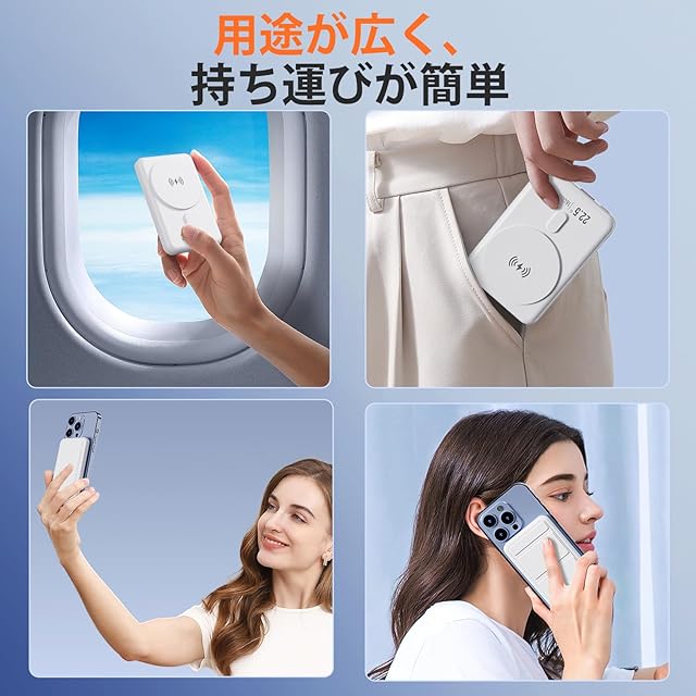 【注意事項】①Magsafe充電はiPhone12~16のみに対応しています。それ以外の機種は、充電ケーブルを使用して充電してください。②複数のデバイスを同時に充電したり、充電しながらスマートフォンを使用したりすると、電力の一部が失われるのは正常な動作です。③モバイルバッテリーに付属の充電ケーブルは、本体の充電にのみ使用できます。出力機能はないため、スマートフォンの充電には使用できません。④モバイルバッテリーはバッテリーを内蔵した電子製品です。衝撃を与えたり、強く押し付けたりしないでください。衝撃を与えると破損する恐れがあります。使用しない時は安全な場所に保管してください。⑤充電中にモバイルバッテリーが熱くなるのは正常な動作です。高温の場所で使用すると、さらに熱くなる可能性があります。⑥モバイルバッテリーは、Magsafe非対応のケースには対応していません。MagSafe対応のケースをお使いください。⑦バッテリーを充電するには、製品に付属の充電ケーブルを使用する必要があります。⑧このモバイルバッテリーはAndroidの充電にも対応しています。携帯がワイヤレス充電に対応している場合は、ワイヤレス充電または充電ケーブルでの充電が可能です。携帯がワイヤレス充電に対応していない場合は、充電ケーブルのみで充電できます。