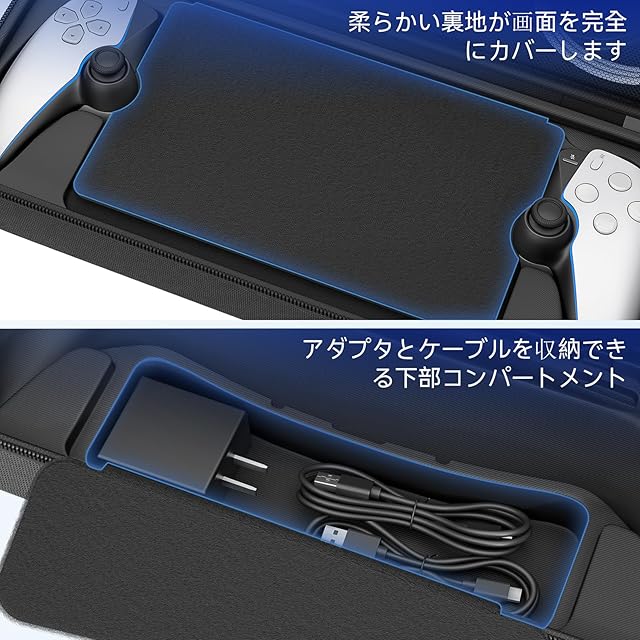 【大容量PS Portal 収納バッグ】PSポータブル ケースはPS Portal本体を収納するだけではなく、上部の内側にチャックのついたポケットがあり、充電器、その他のアクセサリーを収納できます。内部にはマジックテープがついており、PS Portal本体をしっかり固定しながら衝撃や揺れから保護できます。