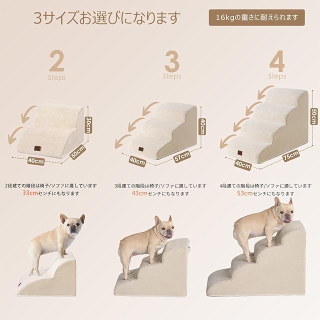 【2つのステップサイズ】この犬用階段には2つのステップと3つのステップがあります。2つのステップは約33センチの椅子/ソファ/ベッドに適しています。3つのステップは約43センチの椅子/ソファ/ベッドに適しています。