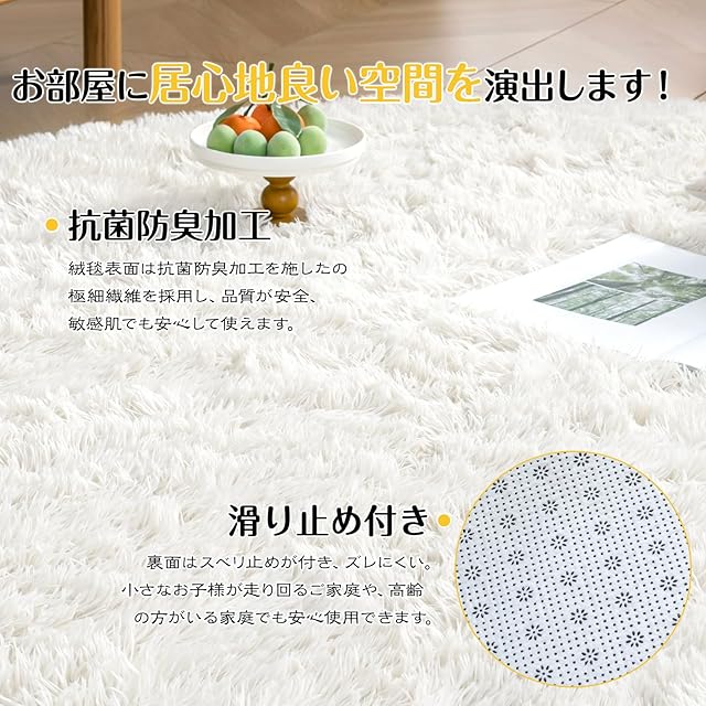 【抗菌防臭・品質良いラグ】抗菌防臭加工を施して、安全な品質で直接肌に触るのも大丈夫です。優れた工芸技術によって毛を強く束ね毛落ちしにくく、毛羽立ちや糸くずがほとんど出ません。購入直後や湿気の多い時期などに変なにおいが気になる場合は風通しの良いところでしばらく干してください。
