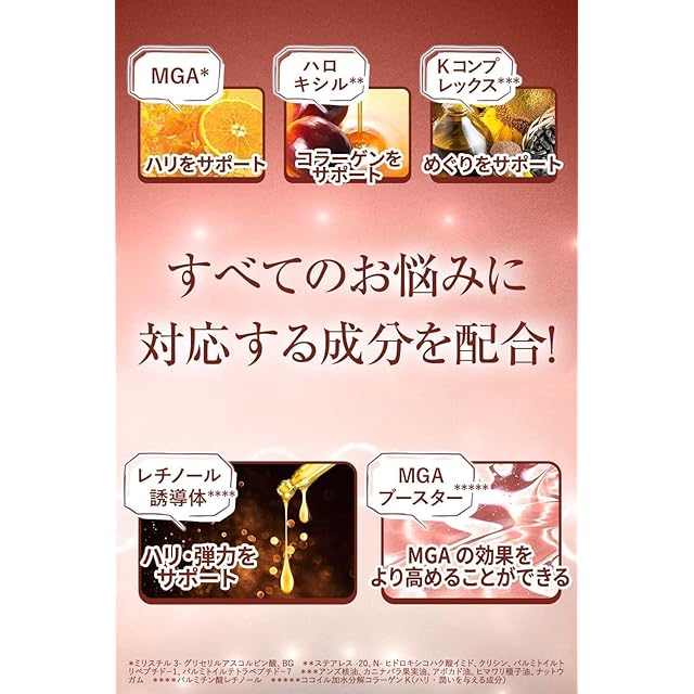 【成分】目の下にハリを与えるMGA*1、さらにMGAブースター*2 を配合。目の下ケアのために開発されたハロキシル*3、肌の柔軟性を保ち潤いを与える成分Kコンプレックス*4、さらにハリ・ツヤを与える成分レチノール誘導体*5も配合。馴染みやすいのが特徴で、角質層まで浸透します。 *1 1ミリスチル3-グリセリルアスコルビン酸、BG *2ココイル加水分解コラーゲンK(皮膚をすこやかに保つ成分) *3ステアレス-20、N-ヒドロキシコハク酸イミド、クリシン、パルミトイルトリペプチド-1、パルミトイルテトラペプチド-7 *4アンズ核油、カニナバラ果実油、アボカド油、ヒマワリ種子油、ナットウガム *5パルミチン酸レチノール