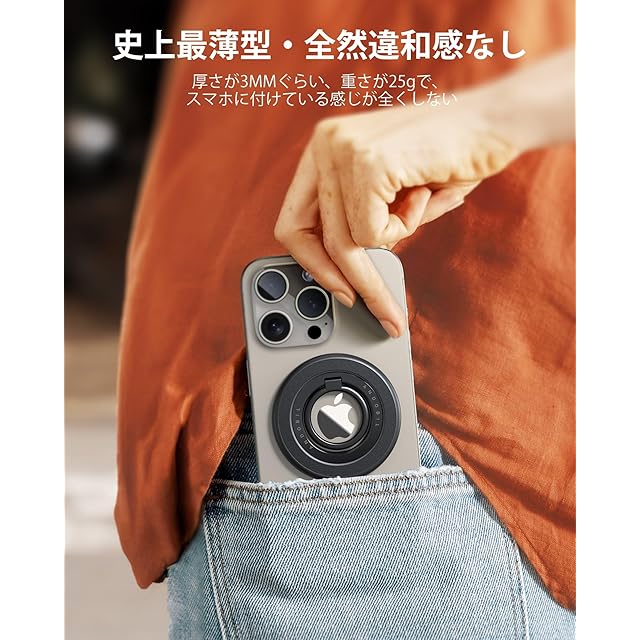 【吸着力3KG・スマホが絶対落ちない】スマホの安全はAndobilが一番大事にしています従来型によくある「磁力が弱くてスマホが落ちやすい」問題に対して、Andobilのプロダクトマネージャーは業界最高レベルのネオジム磁石(N55)を20個も内蔵し、低コスト磁石使用の一般タイプのマグネットリングより吸着力を60倍以上に向上しましたAndobilが選んだ磁石の強さは、普通の磁石(N52)の10倍とされて、3035Nの磁気吸着力があります強力な磁力でどんな状況でもiPhoneを少しも揺らさずにキープすることができ、ずれ落ちる心配なく快適ですまた、伝統的な粘着式スマホリングと違って、マグネットタイプなので取り外しが簡単テープ跡や糊残りを気にせずお使いのiPhoneをきれいな状態でご利用いただけますまた、MagSafe対応ケースであればiPhone 16/15 /14 /13 / 12シリーズにケースをつけたままでも使用できます
