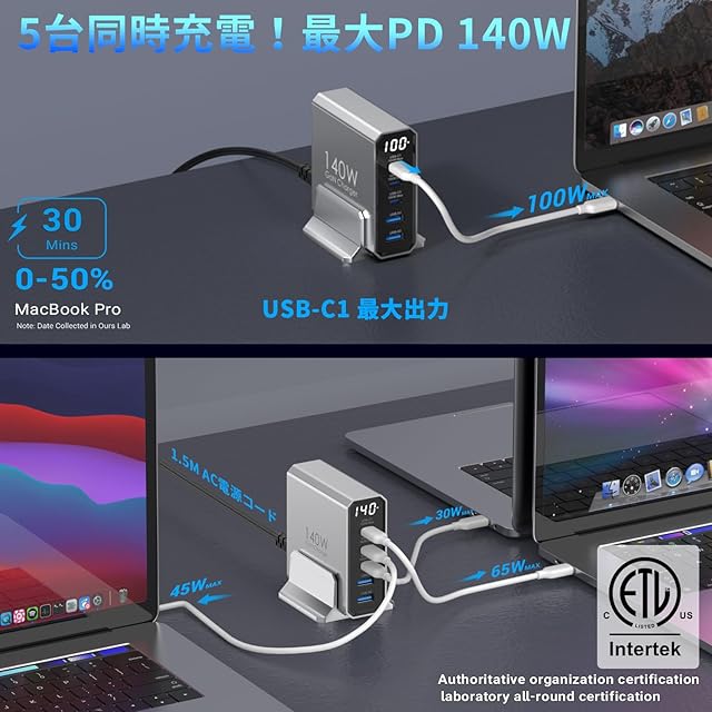 【5 IN 1・140W急速充電】TOPADREはハイパワー充電器専門の会社;三つ*100W*USB-C+二つ*60W*USB-Aポートを搭載、様々なデバイスの充電ニーズに対応できる卓上充電器です。合計140Wの高出力で、5台の機器を同時に超速充電することができます。一つの充電器だけで、ご家族の複数デバイスを同時に充電可能となり、充電時間を大幅に短縮できます。ご注意:複数のデバイスを同時に接続した場合、新しいデバイスを接続したり、デバイス抜いたりすると、充電器が各ポートの電力を最適に再配分することで充電が瞬断することがあります。