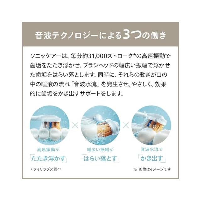 ✅【音波水流】ブラシの振動と振幅の力が、歯垢を落とすと同時に、口の中の唾液の流れ「音波水流」を発生させます。ブラシが届きにくいところも、水流の力でやさしく効果的にかき出すサポートをします