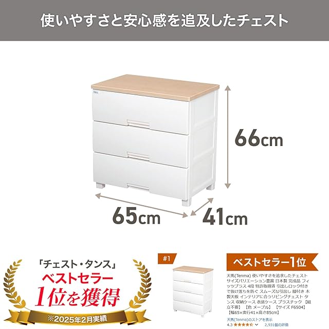 天馬(Tenma) 使いやすさを追求したチェスト サイズバリエーション豊富 日本製 完成品 フィッツプラス 3段 特許取得済 引出しロック付きで抜け落ちを防ぐ スムーズな引出し 脚付き 木製天板 インテリアに合うリビングチェスト タンス 収納ケース 衣装ケース プラスチック 【組立不要】 【色 メープル】 【サイズ F6503】 【幅65×奥行41×高さ66cm】 | primer