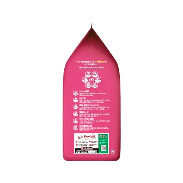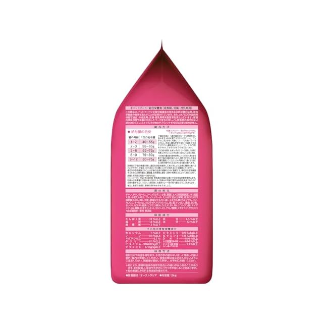 原材料:チキン、チキンミール、コーングルテン、小麦、鶏脂(オメガ6脂肪酸源)、米、脱脂大豆、小麦たんぱく、フィッシュミール、たんぱく加水分解物、魚油(オメガ3脂肪酸(DHA)源)、大麦、酵母(βグルカン源)、ミネラル類(カルシウム、リン、カリウム、ナトリウム、クロライド、マグネシウム、鉄、銅、マンガン、亜鉛、ヨウ素、セレン)、カラメル色素、ビタミン類(A、D、E、K、B1、B2、パントテン酸、ナイアシン、B6、葉酸、ビオチン、B12、コリン、C)、アミノ酸類(メチオニン、タウリン)