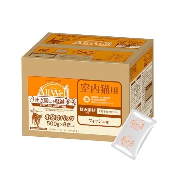 [吐き戻し軽減] All Well(オールウェル) キャットフード ドライ [室内猫用] 贅沢素材入り フィッシュ 4.0kg (500g×8袋)【国産/小分けパック/ケース品】