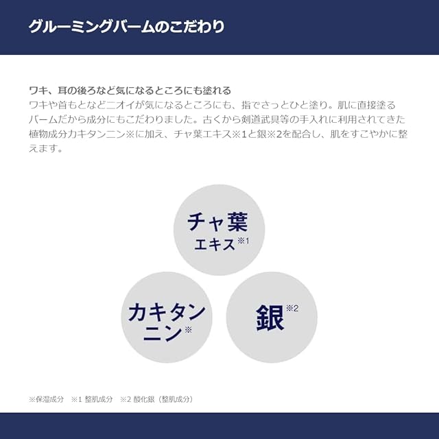 【香水未満のほのかな香り 「塗る、フレグランス」】香りを練り込んだバーム状フレグランス。バームに練り込まれた状態のため香りが飛びにくく、安定した香りを長時間キープできます。香水ほど主張しないほのかな香りで、ビジネスシーンにも邪魔になりません。シトラスの上品な爽やかさと深みを感じる洗練された「グルーミング・シトラス」の香り。