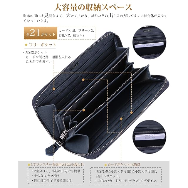 【大容量で使いやすい】ラウンドファスナの長財布で蛇腹に開くため、お札を分けたり、レシートを分けたりと細かく収納することができます。カード入れは片側6枚づつ収納可能で、小銭入れの横側にも3箇所あり、合計15枚のカードが収納できます。カード入れの背面にはそれぞれフリーポケットを備えています。また、小銭入れはL字型ファスナーを採用しており、大きく開き、内部を2室に仕切ったセパレート型で、日本円の硬貨を分けて入れることができ、会計の時はスマートで、使い勝手が抜群です。