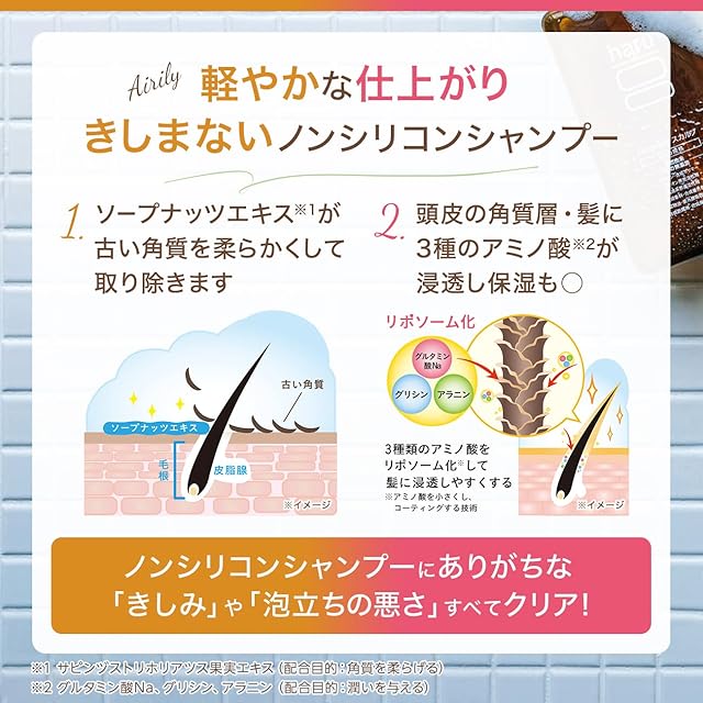【きしまないノンシリコンシャンプー】天然由来シャンプーにありがちな、キシミや泡立ちの悪さがなく、仕上がりがなめらかな100%天然由来のシャンプーです。アミノ酸系の洗浄成分配合なので、汚れを落としながらうるおいも守ります。フケやかゆみ、ニオイ(※1)や紫外線ダメージが気になる方にもおすすめです。※1洗い流すことによる