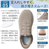 メッシュ スリッポン:アッパーには通気性抜群のメッシュ素材を採用し、長時間履いても靴内が蒸れにくく、夏場でも快適に履けます。歩くたびに空気が循環し、足元を快適に保ちます。さらに、足の形にしっかりフィットするデザインなので、外反母趾や甲高に悩む方にもおすすめ。一日中立ち仕事をされる方の足の疲れを軽減し、快適な履き心地を提供します。