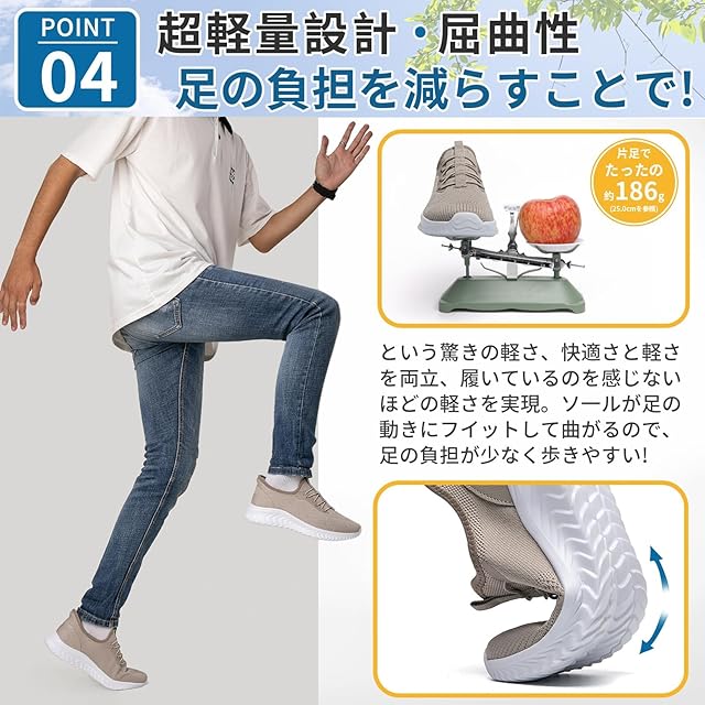 立ち仕事靴 軽い:片足わずか約186gの超軽量設計で、まるで靴を履いていないかのような軽さです。EVA素材を使用したソールはクッション性に優れ、長時間歩いても足への負担を軽減します。立ち仕事や通勤、長時間の移動など、足を酷使するシーンでも、負担を感じさせない快適さが特徴です。軽くて疲れにくいので、毎日快適に過ごせます。