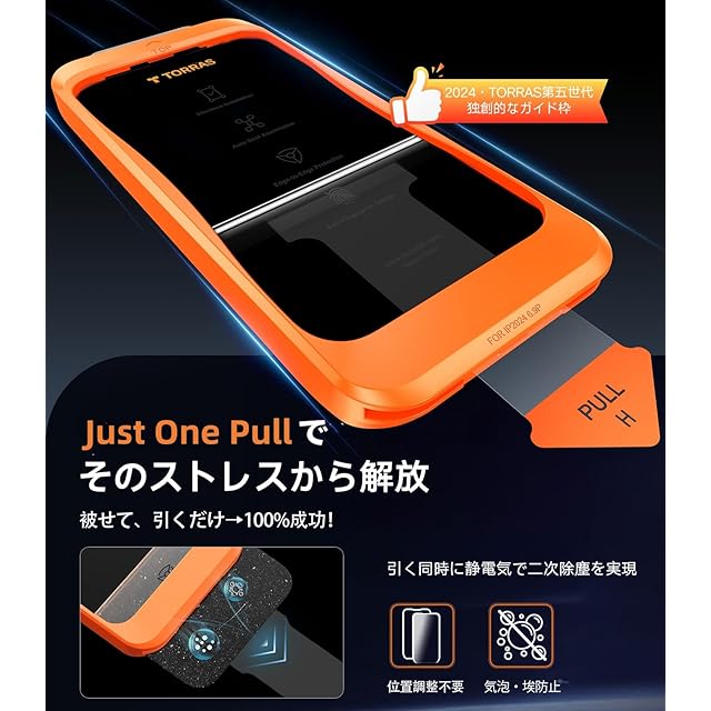 【Just One Pull・貼り付け超簡単】TORRASの第五世代ガイド枠により、Just One Pull→ハンドルを引く、完璧な仕上がり。引き出し時の静電気で二次除塵も実現すれば、自動排気機能も搭載。「自分で貼ると歪み、気泡、ホコリ、浮きなどの問題が起こりやすい」というストレスから解放~素人でも100%完璧に貼り付け。そして、iPhone 16 Pro 用ガラスフィルムは極限まで磨いたラウンド加工技術を採用し、滑らかで手に優しく美しい狭いベゼルを忠実に再現。まるでオリジナルデザインの一部であるかのように、完璧な一体感を。※Just One Pull枠は2020年に市場初登場し、現在は第5世代の製品である。業界一番上の便利さと簡単操作、成功率の高い画期的な貼り付けソリューション。(*気泡除きヘラは白い箱の後ろにある。ページに気泡の取り除きビデオが付き。)