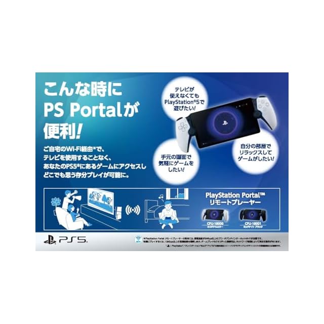 PlayStation PortalがPS5 本体にWi-Fi経由で接続することで、PS5 からゲームプレイをそのまま引き継いでPlayStation Portalでお楽しみいただけます。 ※PlayStation Portal リモートプレーヤーでゲームをプレイするためにはPS5本体と、Wi-Fi接続で最低5Mbps のブロードバンドインターネット接続環境が必要です。よりよいプレイ体験のためには15Mbps 以上の高速な接続環境を推奨します。