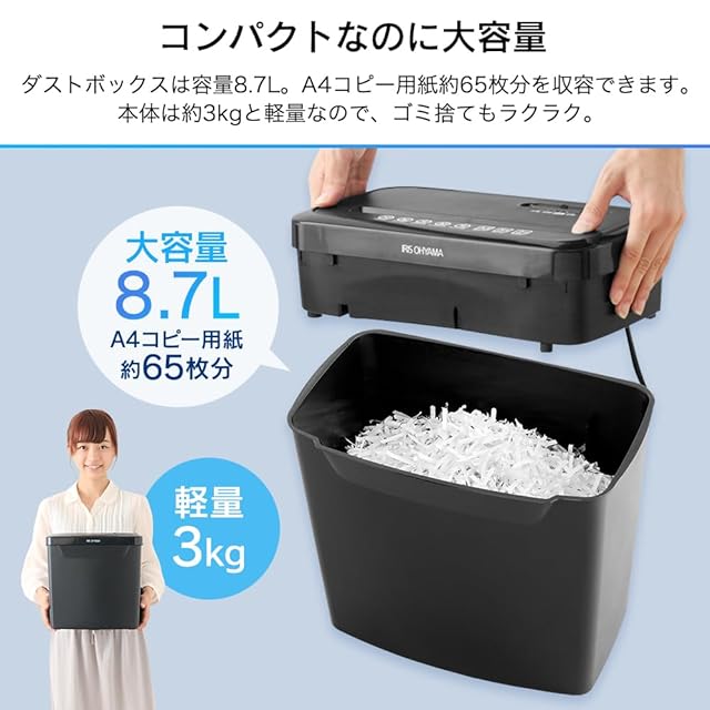 ダストボックス容量 “8.7L”のたっぷりめで、A4コピー用紙が約65枚分収容可能です。