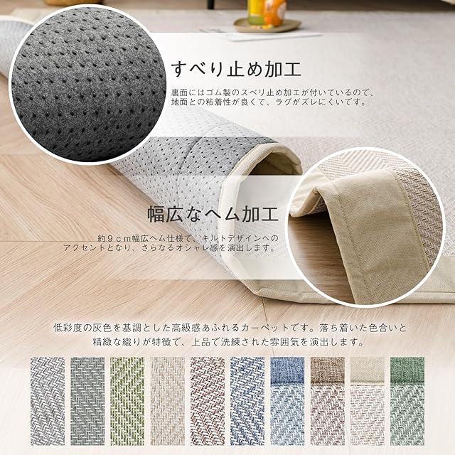 【オールシーズン快適】カーペットの取材は服と同じ繊維を使っているため、適度な厚みで空気をたっぷり含んで断熱します。生地がサラッとした感触なので、夏でも裸足で気持ち良いです。裏面に耐熱加工を施しているので、床暖房のお部屋での使用やホットカーペットカバーとしてもOKです。