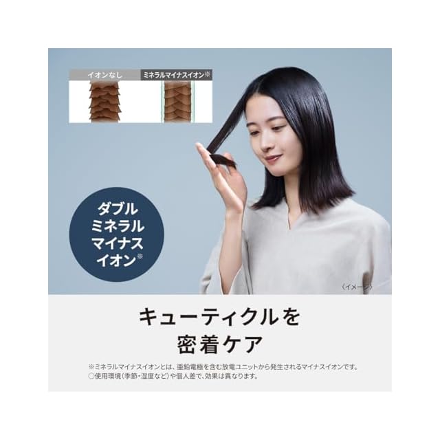 ダブルミネラルマイナスイオン※で、キューティクルを密着ケア。UV・摩擦ダメージ抑制しながら、指通りのよいさらさら髪へ。※ミネラルマイナスイオンとは、亜鉛電極を含む放電ユニットから発生されるマイナスイオンです。