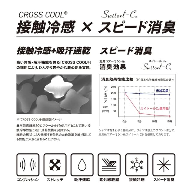 素材:本体/ポリエステル85%・ポリウレタン15%、吸汗速乾、UVカット、接触冷感、スピード消臭