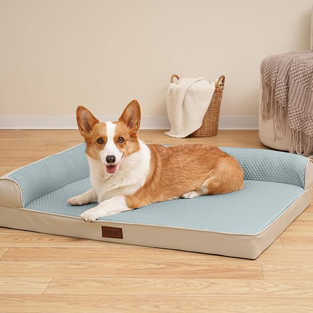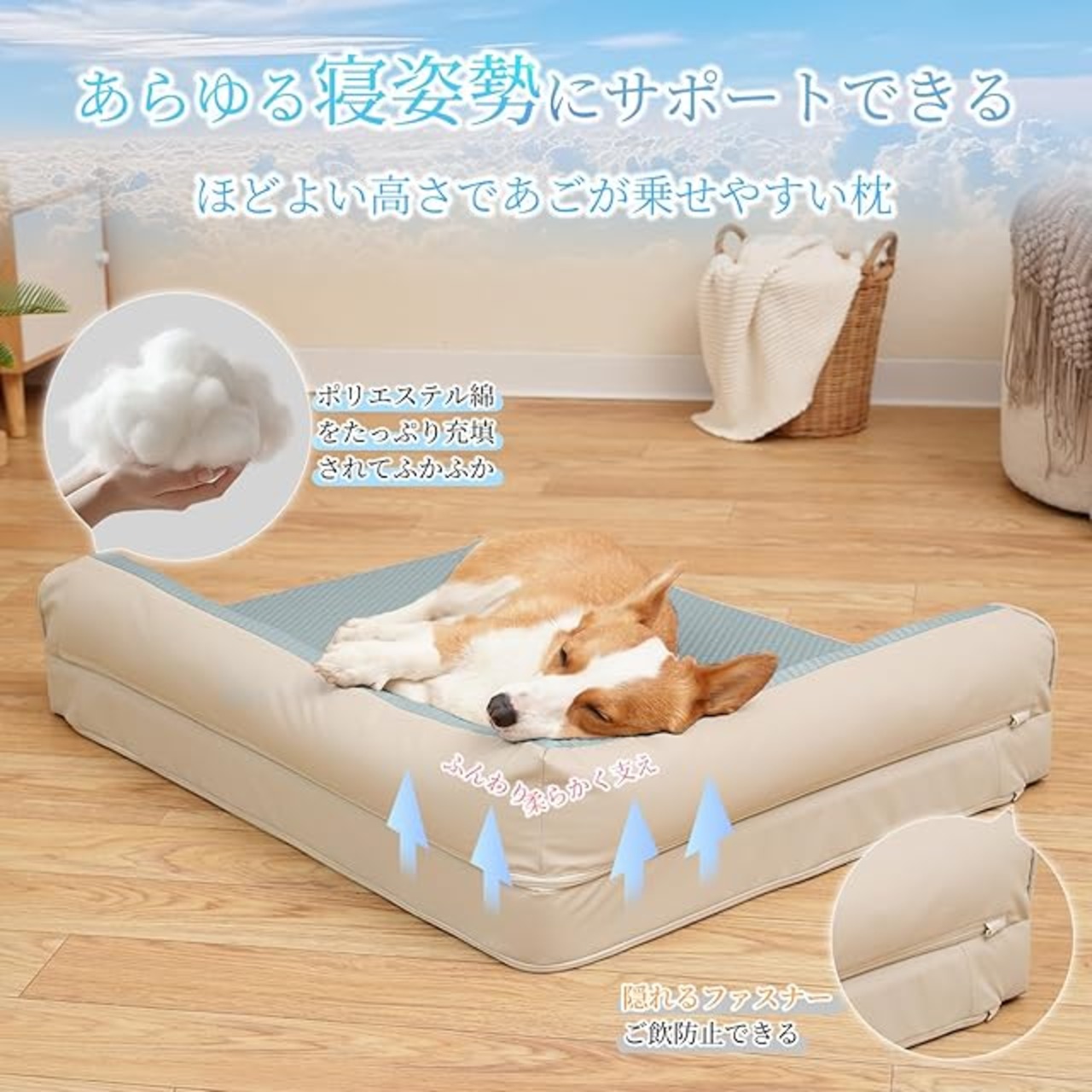 EMME L型犬ベッド冷感 ひんやり ペットベッド Q-max値0.4 涼しいペットソファー ペットクッション 枕付き 高反発 抗菌防臭 高齢犬 子犬 猫 多頭飼い 取り外せるカバー 滑り止め 中型犬 大型犬 洗える ペット用ベッド64x49x14cmスモッグブルー Sサイズ | primer