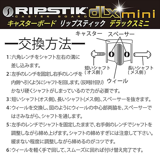 【バランス感覚を養うスポーツに】リップスティックデラックスミニは加速やカーブを楽しみながら、単なる遊びで終わるだけでなく体幹トレーニング、バランス感覚を付けることに役立ちます。身体全体でバランスをゆったり乗る乗り方は特に体幹が鍛えられます。足だけ動かして乗る乗り方は後方ウィールのすり減りが速いです。ウィールを交換して、前輪と後輪の高さを一定にして下さい。