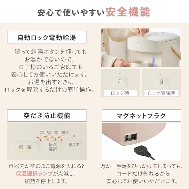 ◆安全機能◆①自動ロック:給湯後10秒間給湯ボタンを押さなかった場合、自動でロックされます。誤って給湯ボタンを押してもお湯がでないので、お子様のいるご家庭でも安心してお使いいただけます。②空だき防止機能:容器内に水が入っていない状態を検知すると自動的に加熱を停止します。