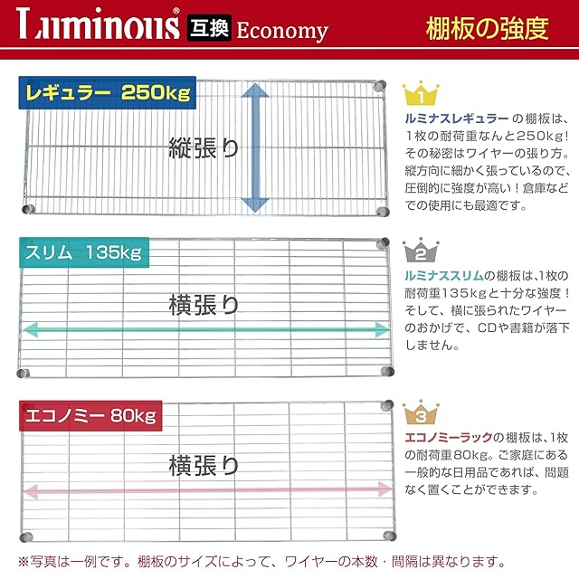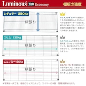 特別企画のスペシャルプライスアイテムです。棚一枚当たりの耐荷重は80kgとなっておりますが、ルミナスのパーツとの互換性があります。